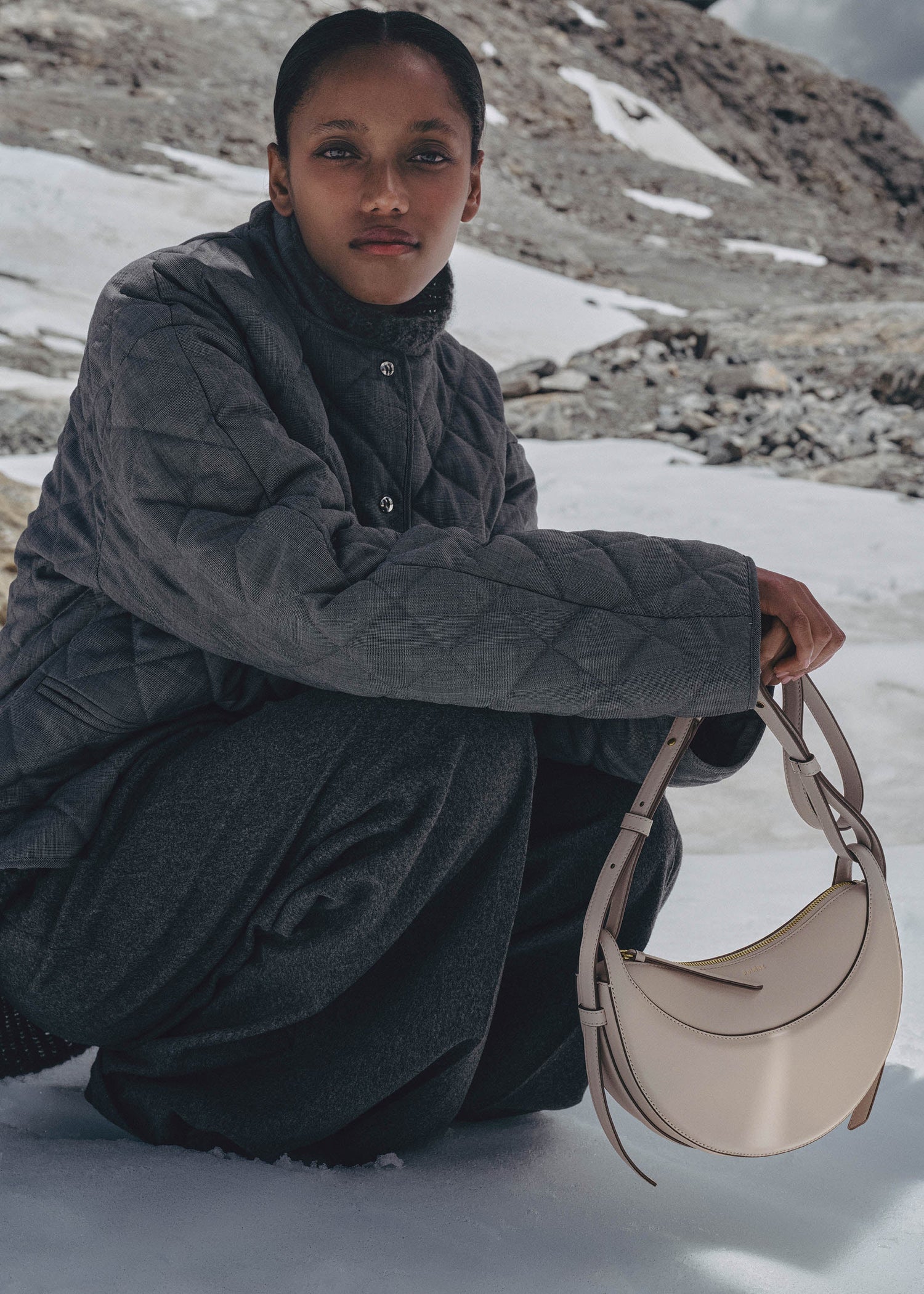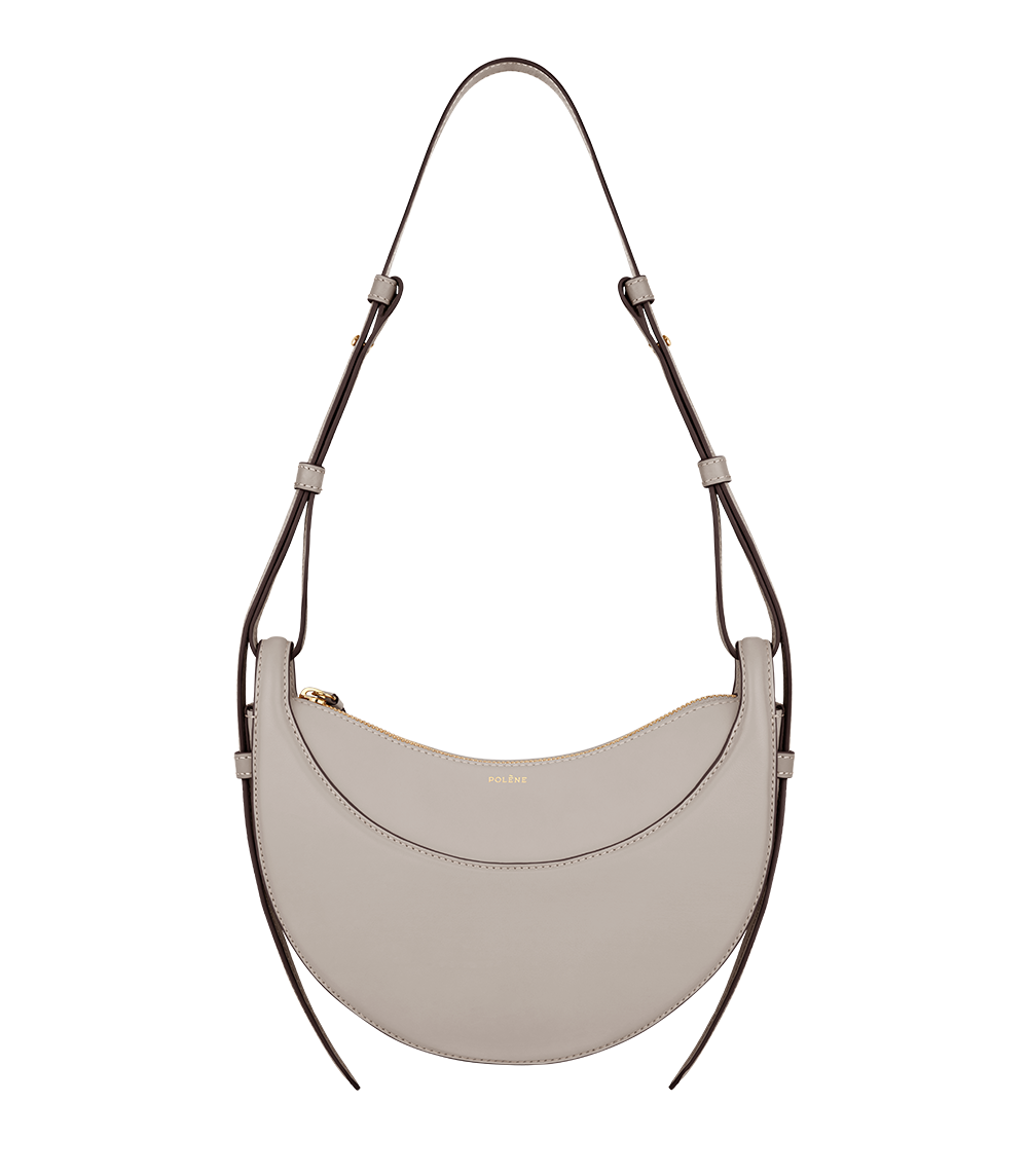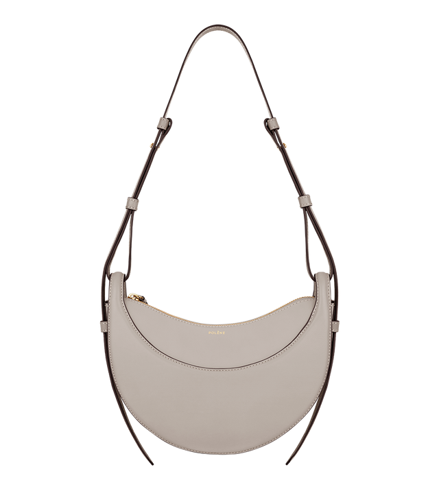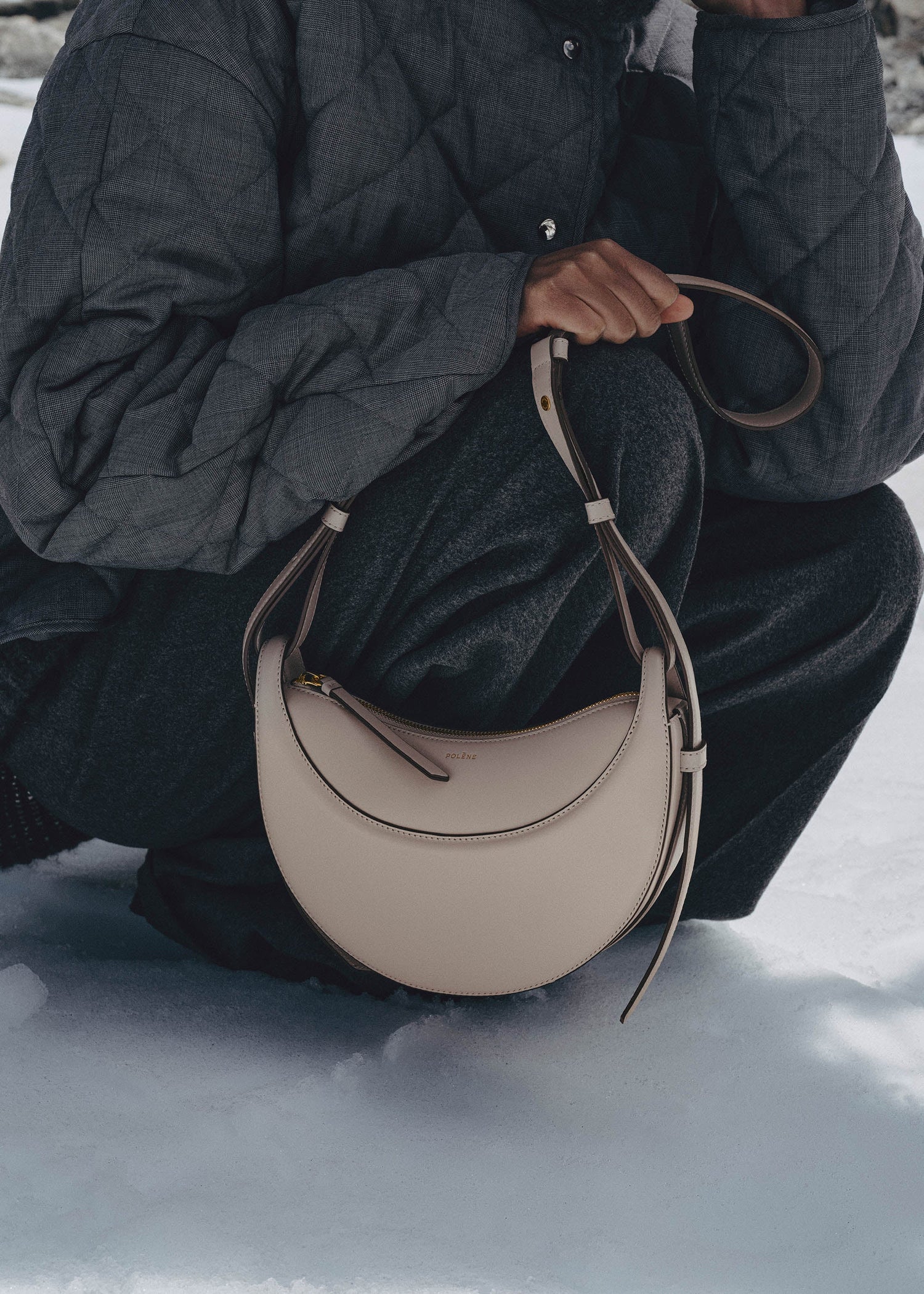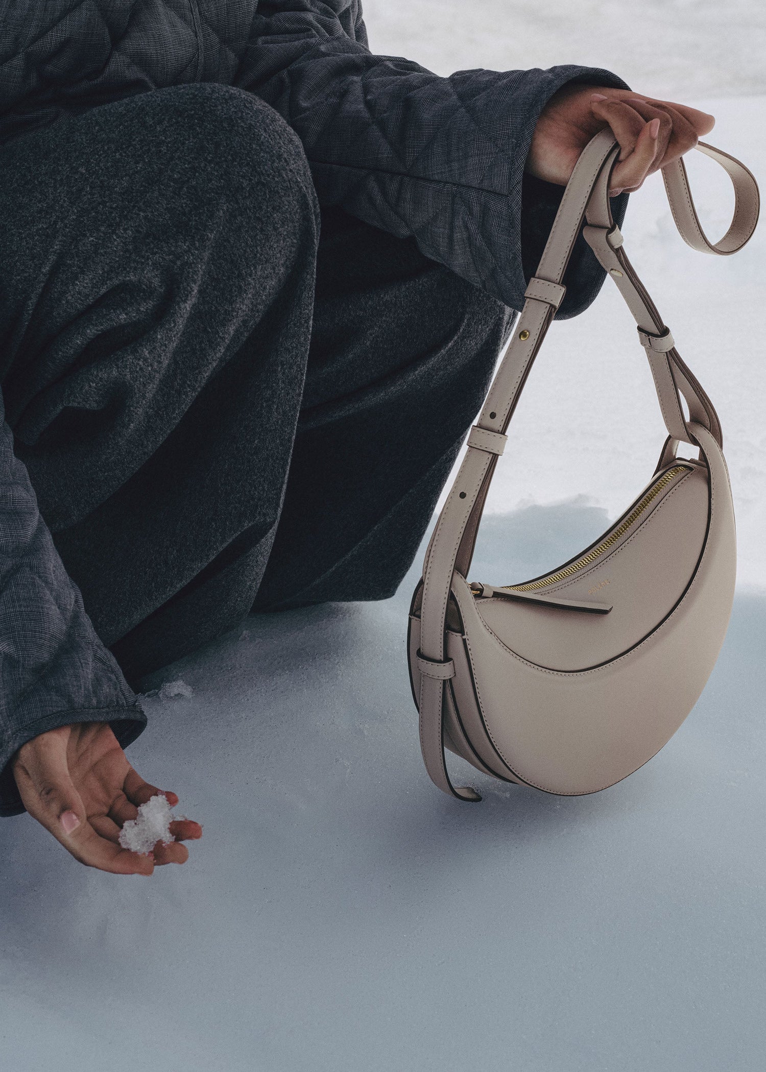 With its rounded shape, foam padding, and hand-stitching, the “Numéro Dix” is a nod to the equestrian codes of saddlery. Its half-moon design highlights juxtaposing curves.
