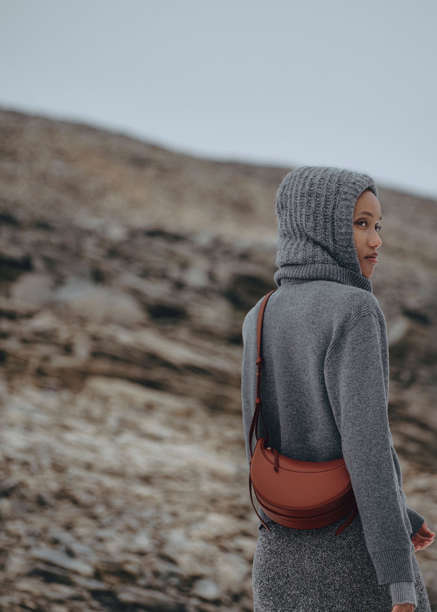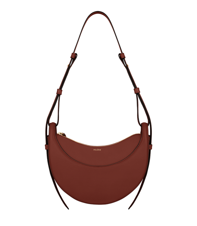 With its rounded shape, foam padding, and hand-stitching, the “Numéro Dix” is a nod to the equestrian codes of saddlery. Its half-moon design highlights juxtaposing curves.